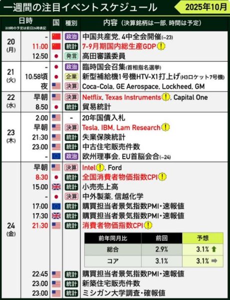 さて来週の経済指標についてですが、現状アメリカ政府の予算が承認されていない状況が続いておりますので不透明な状況ですね。今月から雇用統計も含めて重要指標の発表が軒並みスルーされてます。いつ状況が変わるかわかりませんので随時ニュースなどで確認をしていきましょう。一応24日金曜日の夜に米CPIの結果が発表される予定です。あと火曜日に日本の首相が指名されるかもしれませんので要注目です!