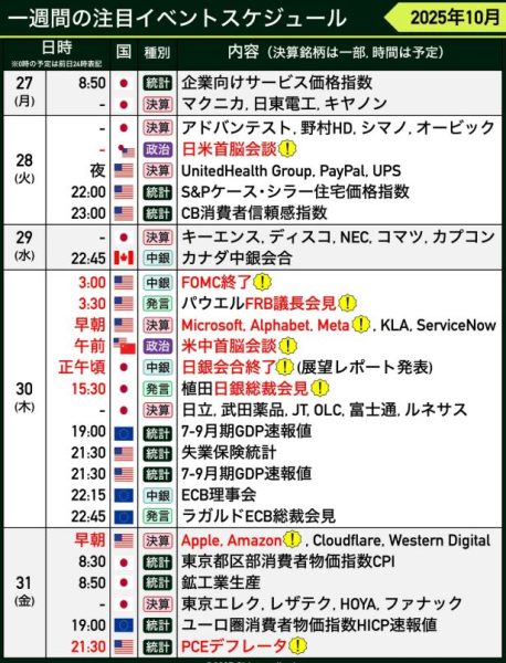 さて来週は、月末でしかもイベントも盛りだくさんとなっております!米政府機関の閉鎖もいつ終わるのか不透明ですが、突然延期されていた重要指標の発表がされることもありますのでニュースには注目しておきましょう。こういった中でFRBがどう動くのかも気になるところであります。来週はかなりヤバイ週となりますので資金管理、指標管理は最大限注意していきましょうね。